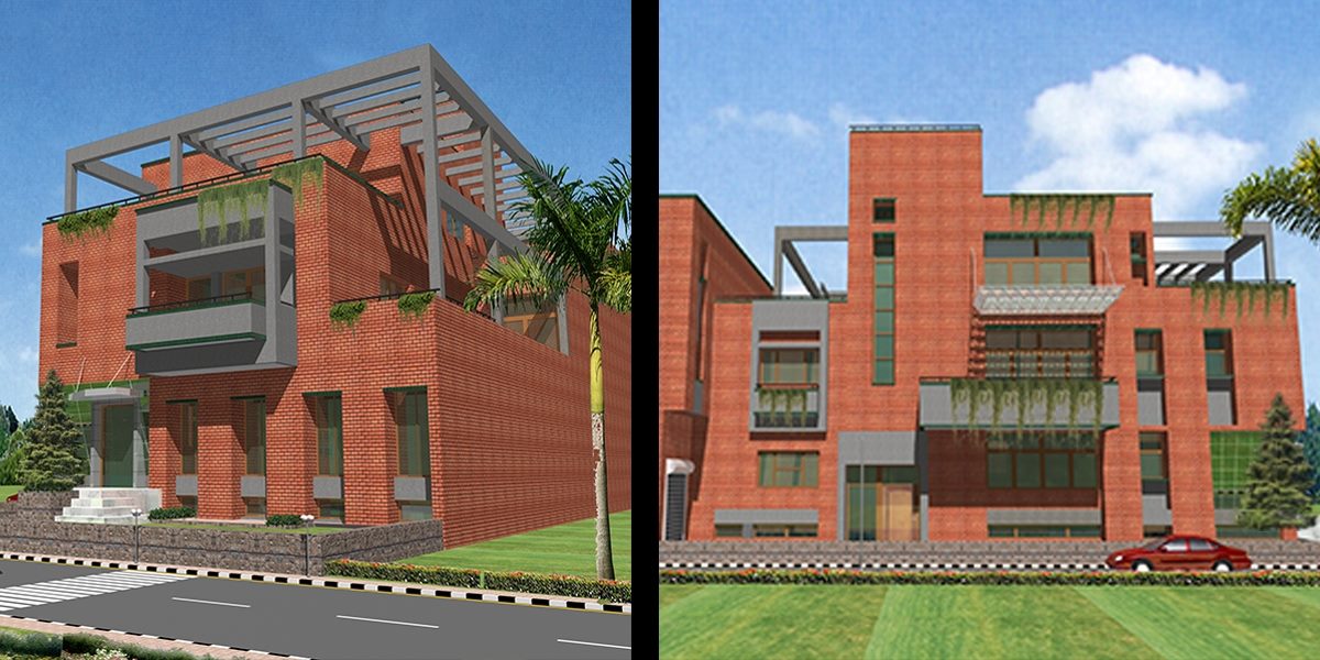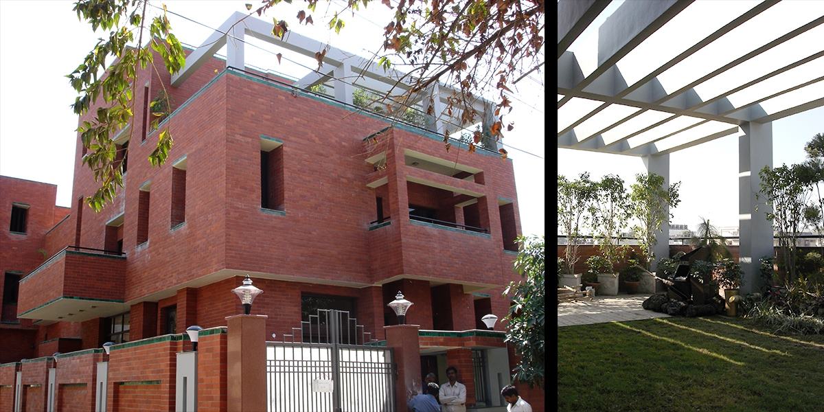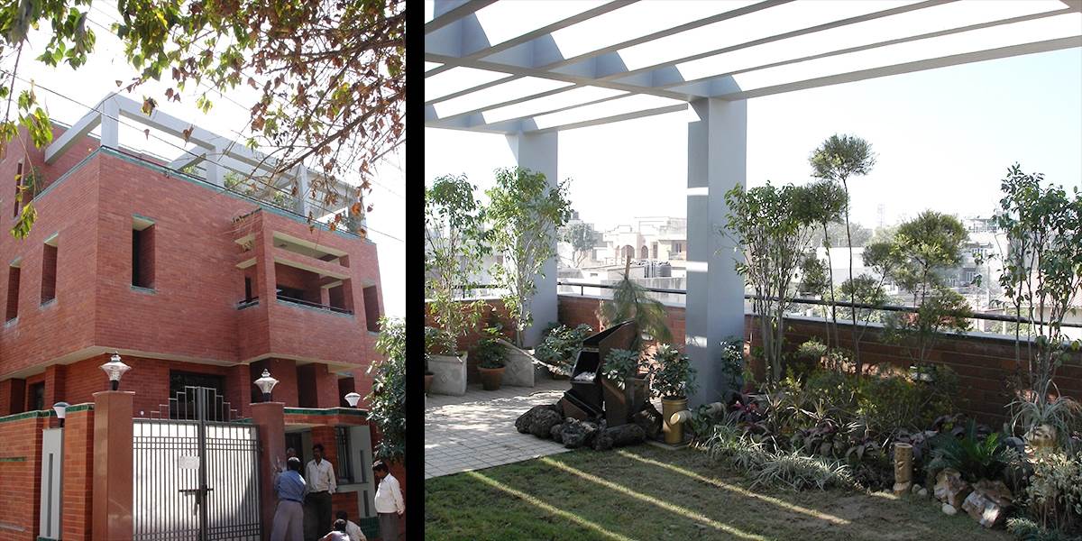 The residence was designed on a 500 sq.yard plot in South Delhi with an builtup area of 6500sq.ft designed as an multilevel house with a lower ground and three upper levels. The lower ground floor has an office space along with recreational facility consisting of a Home theatre. The upper levels have been designed with built volumes as double height spaces and a central atrium flushed with natural light. The living areas converge into common lounges each having extended open space in form of terraces and balconies. The top floor at terrace level has a gym and a party hall and a terrace garden shaded with pergolas. The façade of the building has been treated with Exposed brick, exposed concrete and hand made tile.