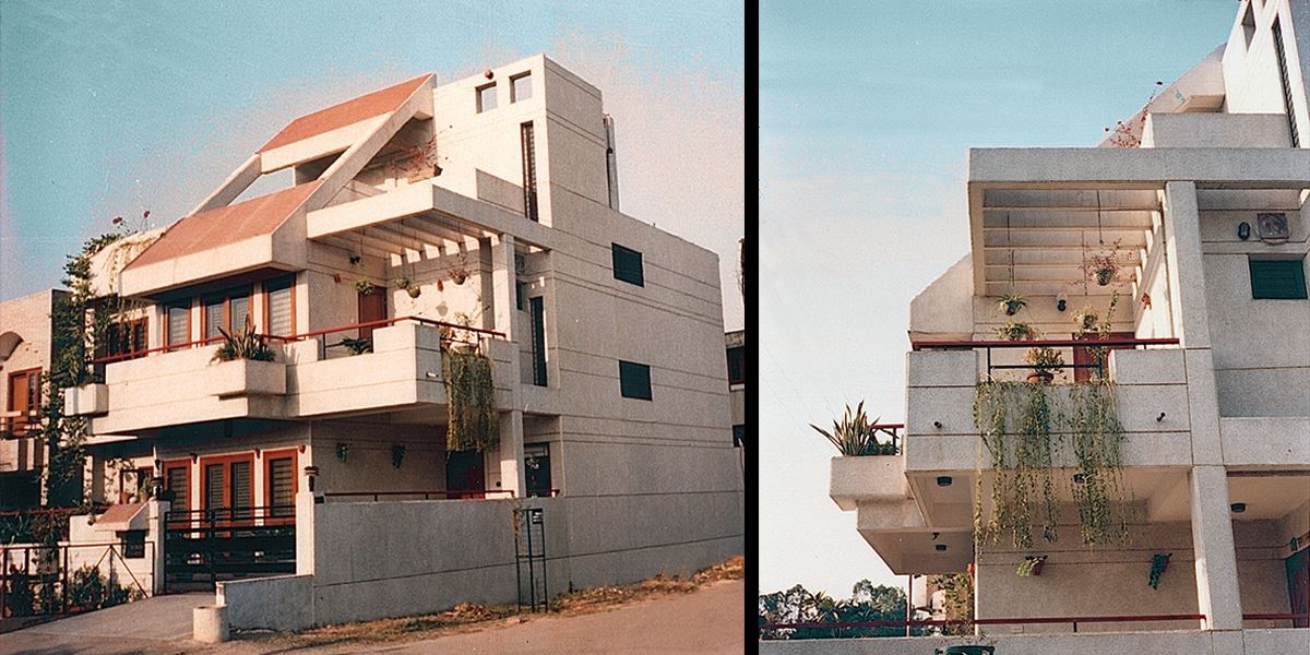 The residence was designed on a 200 sq.yard plot in Sector 30, Noida with an builtup area of 3200sq.ft designed as an duplex house with a ground and two upper levels.. The upper levels have been designed with built volumes as double height spaces and a central atrium flushed with natural light and treated with exposed bricks. The living areas converge into common lounges which overlook into Dining hall below, having extended open space in form of terraces and balconies. The top floor at terrace level has a Lounge and a terrace garden shaded with pergolas. The façade of the building has been treated with pergolas, White Grit finish, Sloping roof and inbuilt planters.